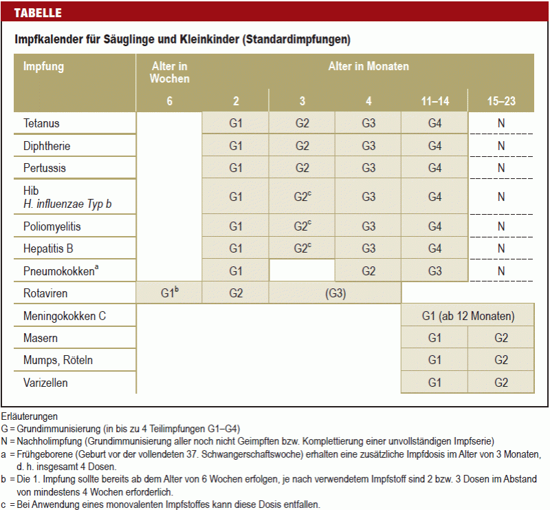 Der impfkalender enthält die empfohlenen standardimpfungen für säuglinge, kinder, jugendliche und erwachsene.